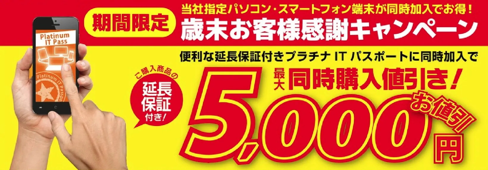 iiyama PCもしくはSIMフリースマートフォン端末をご購入時に、月額会員サービス「プラチナITパスポート」の指定プランにご加入いただいた場合、最大5,000円割引を実施いたします。