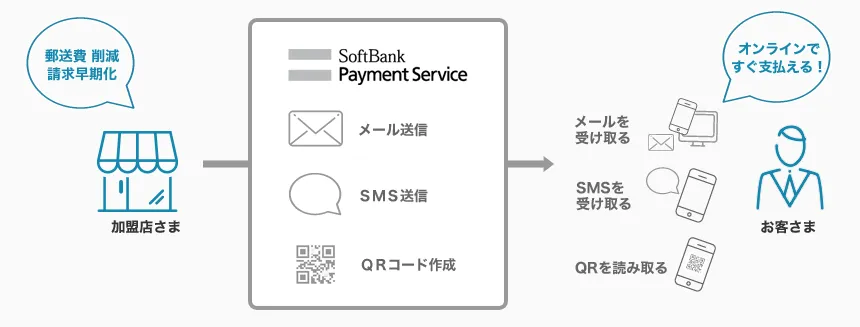 SBPSの「メールリンク型サービス」は、事業者さまのビジネスモデルにあわせて、メール、SMS、QRコードの請求方法を選択できます※。メール、SMSはSBPSがお客さまに送信するため、事業者さまはメール送信の設備がなくてもご利用いただけます。QRコードは店頭などで表示し、お客さまのスマートフォンで読み取ることでお支払いもできます。
