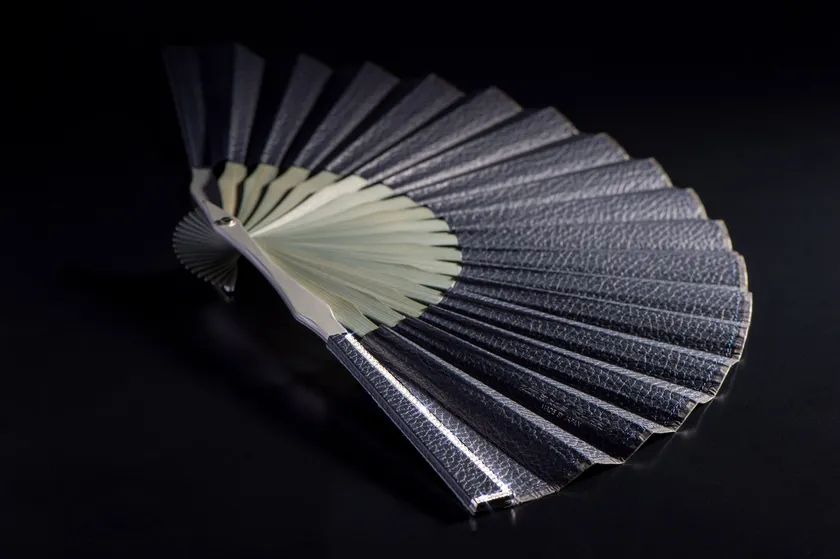 通常、扇子の親骨は竹を使うのが一般的ですが、SENSEは18Kやアルミニウムを使用しています。細部にまでおよぶこだわりも、東京が誇る職人の技術だからこそ実現。また、扇面のレザーは、イタリアから取り寄せた逸品です。発色の鮮やかさ、革の質感を最大限まで生かし、手作業で0コンマまで薄くします。最後の仕上げは京都の扇子職人により、一つひとつ丁寧に折加工を行うことで完成。日本の職人の技術の結晶が、この一本に込められているといっても過言はないでしょう。