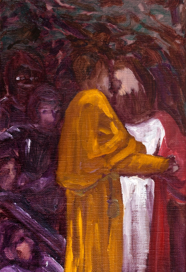 大矢は、日常に起きる凡庸な人々の営みから聖書に住む聖人の世界まで、様々なレベルで引き起こされる出来事とその出来事に翻弄される人間の感情をカンバスにとどめています。