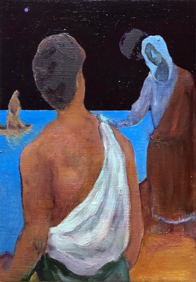 “大矢一穂の作品は、物語の瞬間を捉えるべく、絵具を滑らせていく”