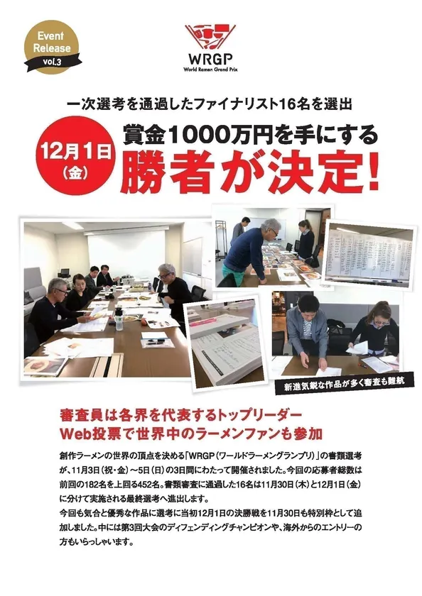 創作ラーメンの世界の頂点を決める「WRGP(ワールドラーメングランプリ)」の書類選考が、2017年11月3日(祝・金)~5日(日)の3日間にわたって開催されました。今回の応募者総数は前回の182名を上回る452名。書類審査に通過した16名は2017年11月30日(木)と12月1日(金)に分けて実施される最終選考へ進出します。