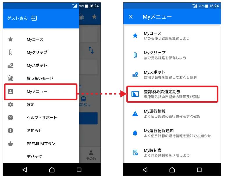 メニューから「Myメニュー」をタップし、「登録済み鉄道定期券」をタップすると、登録した鉄道定期券を確認・削除することができます。