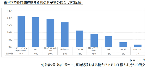 乗り物に乗って、長時間移動する機会があるお子様をお持ちの男女1,117名に、乗り物内でお子様がしていること・使っているものを調査しました。