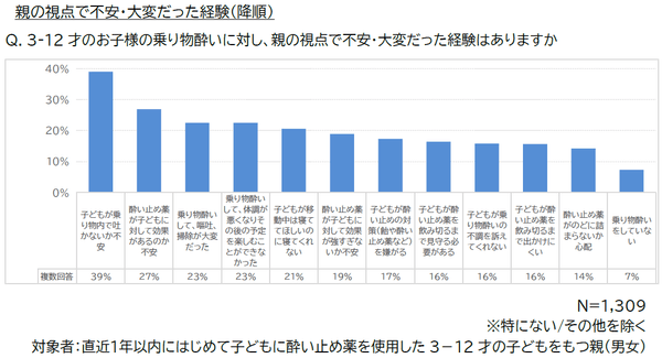 直近1年以内にはじめてお子様に乗り物酔い止め薬を使用した、3-12才のお子様を持つ親(男女)1,309名を対象に行った調査で、親の視点で乗り物酔いで不安・大変だった経験を聞いたところ、「子どもが乗り物内で吐かないか不安 」が39%で1位に挙がりました。