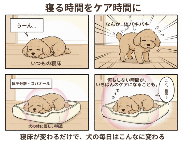 【寝てる間に健康をサポート】 犬用リカバリーベッドがクラウドファンディングに登場。特許高機能素材「スパオール」で、血行促進・体幹安定・リラックスへ導く。ペットの不安や興奮を抑えぐっすり快眠をサポート。