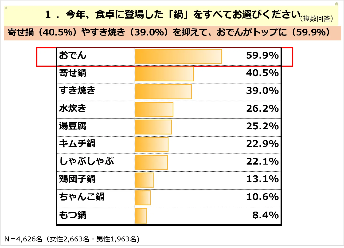■今年食卓に登場した鍋は、「寄せ鍋(40.5%)」や「すき焼き(39.0%)」を抑えて「おでん(59.9%)」がトップに。