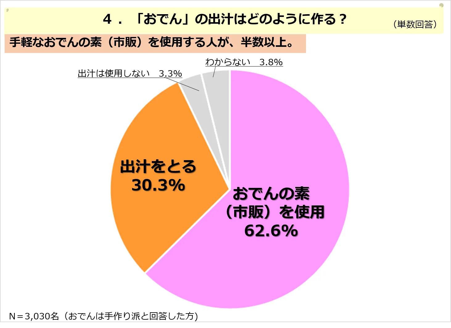 ■おでんを作るときの出汁は、62.6%が「おでんの素(市販)」を使用し、30.3%が「自分で出汁をとる」。