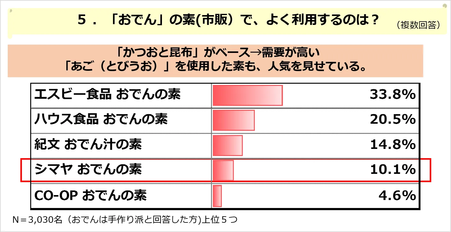 今回の調査では『かつおとこんぶ』がベースである、おでんの素の需要が高かったが、「シマヤおでんの素(10.1%)」のように、九州地方や西日本では定番であり、プロの料理家や料理好きな方の間では広く知られている『あご(とびうお)』がベースであるおでんの素も愛用する方が増えつつある。