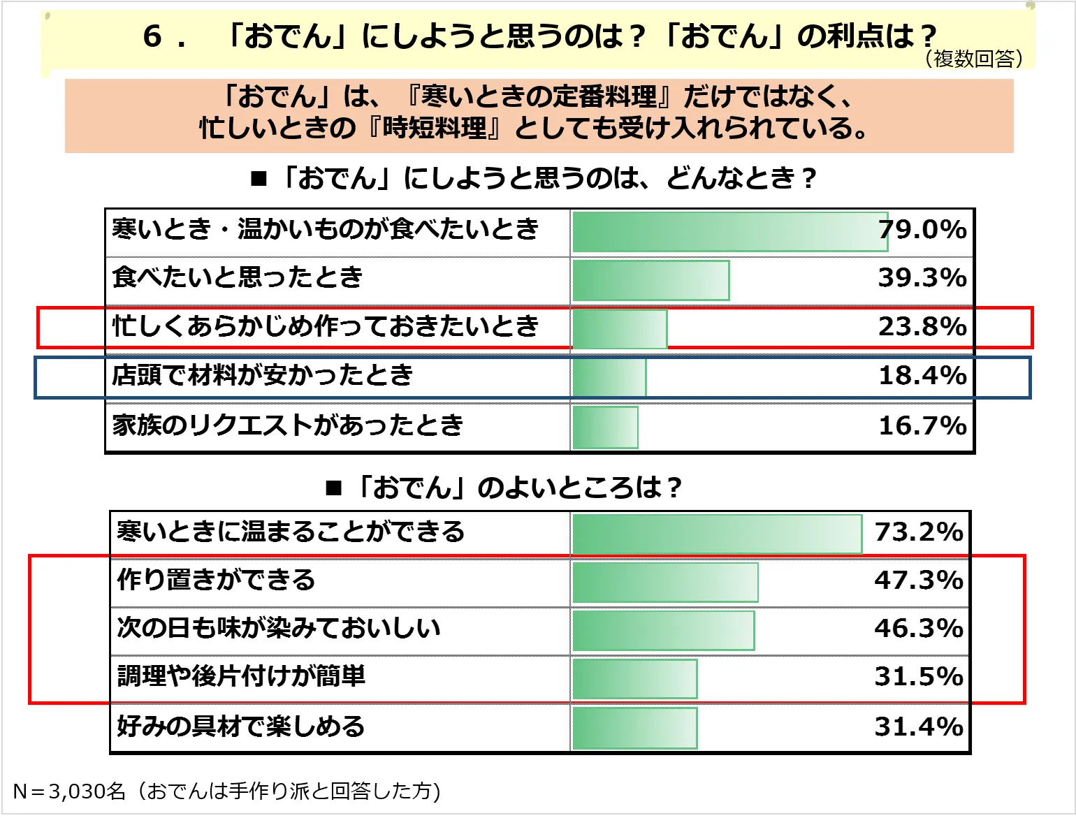 ・おでんは、体を温める『寒いときの定番料理』ではなく、『忙しいときの時短料理』としても受け入れられ、作るきっかけとしては「店頭で材料が安かったとき(18.4%)」など、おでん用食材の特売なども影響している。