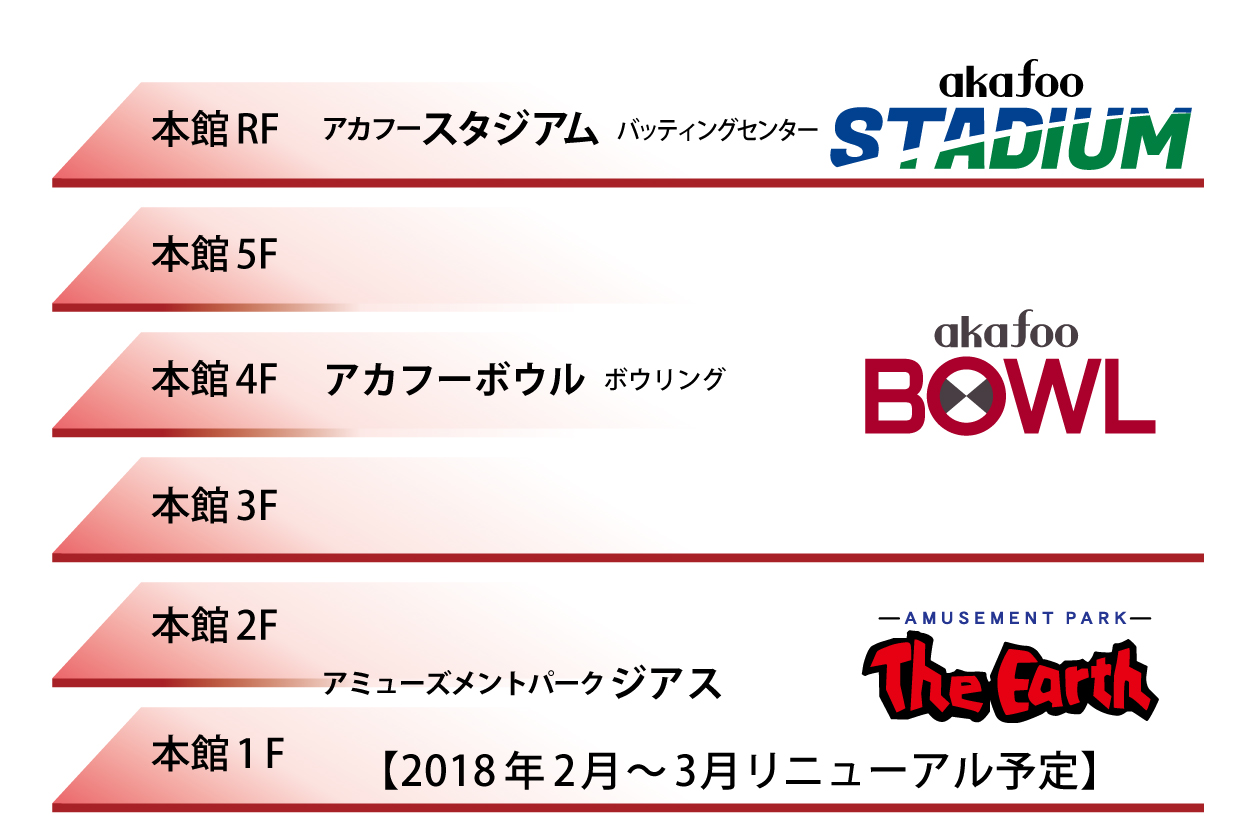 施設サインのトップに飾られるボウリングピンが象徴するように、「アカフーパーク」の原点とも言えるボウリング場が「akafoo BOWL(アカフー ボウル)」としてリニューアル。同じく、本館の屋上には、バッティング、ダーツ、ビリヤード他が楽しめる「akafoo STADIUM(アカフー スタジアム)」もオープンし、家族や友達とアクティブに楽しめるスポーツ&アミューズメントビルに進化します。本館1F・2Fは、メダルゲームやアーケードゲーム、クレーンゲームを楽しめるゲームが満載。本館はまるごと「わくわくエンターテイメント」な施設に生まれ変わります。