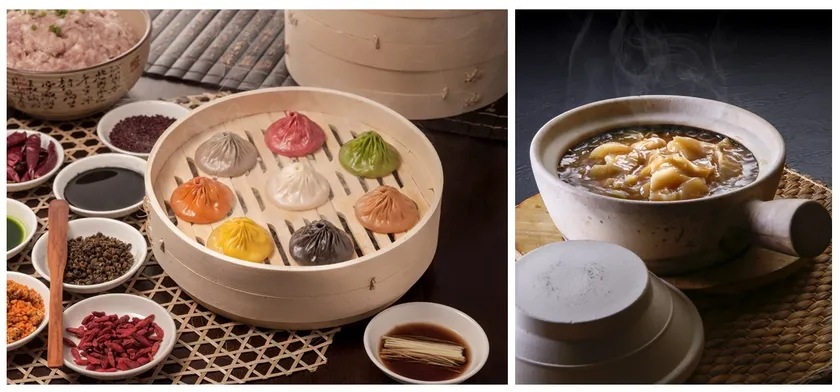 写真左:シグネチャーメニュー「8色小籠包」 写真右:「フカヒレあんかけ土鍋ご飯」