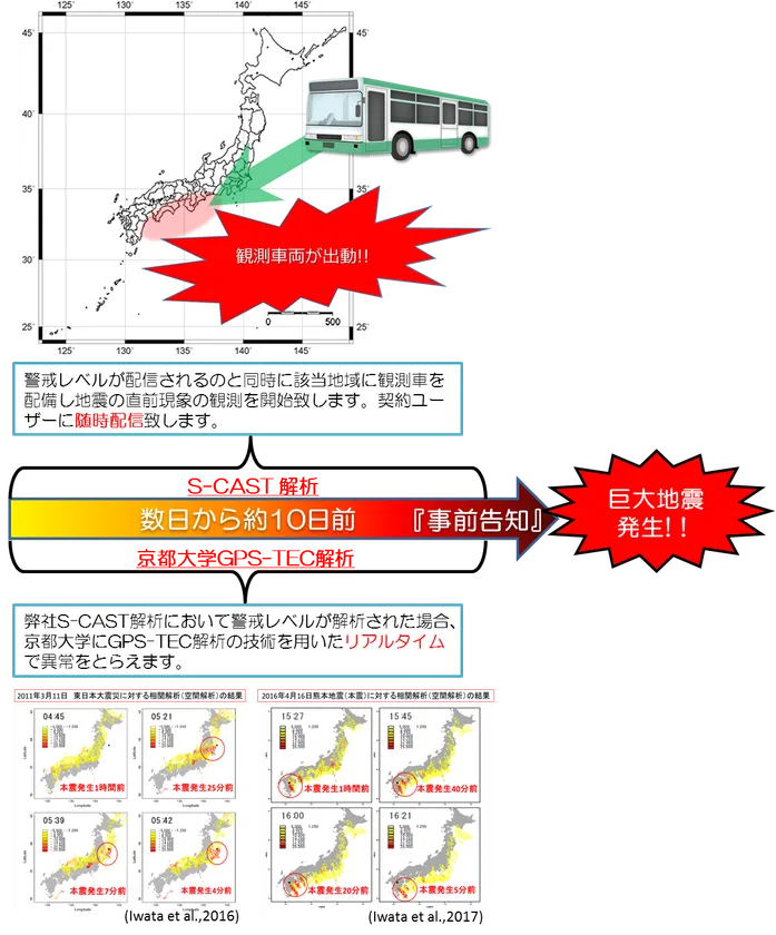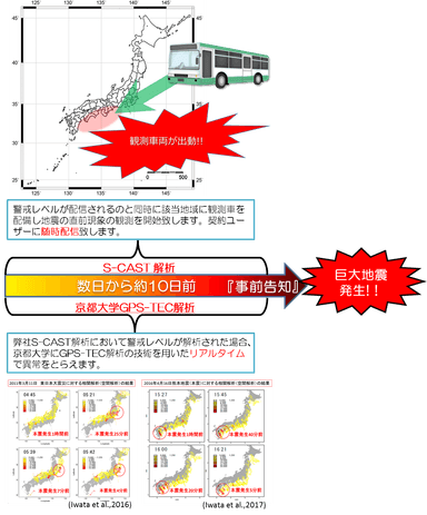 図のように、当社は「S-CAST」の解析で警戒レベルが解析された際に、巨大地震の直前現象を観測します。さらに京都大学の技術を用いたGPS-TEC解析を行うことでリアルタイムに異常をとらえ、BCP対策や避難の最終決断に有効に活用することができます。