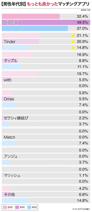 次に、男性についても年代別で比較したところ、1位が「ペアーズ」、2位が「Tinder」で、年代を問わず共通でした。「Tinder」は、女性の平均が9.1%に対し男性は20.1%で、男女で評価に大きな差が見られます。「Tinder」は男性からの支持率が高いと言えそうです。