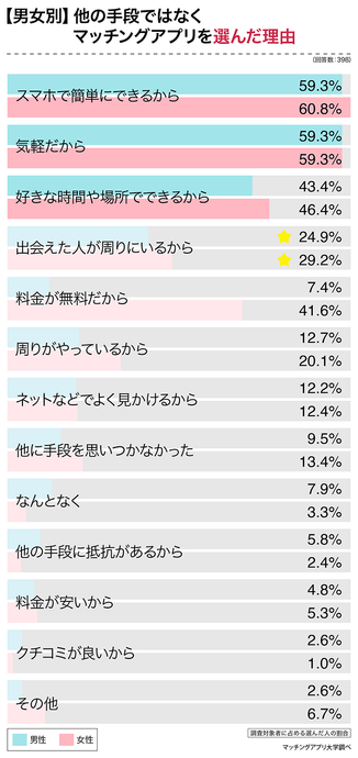 では、「なぜ他の手段ではなく、マッチングアプリを選んだのか」について聞いてみました。すると、男女ともに「スマホで簡単にできるから」「気軽だから」「好きな時間・好きな場所でできるから」が3トップとなり、いずれも50〜60%の人から支持されました。
