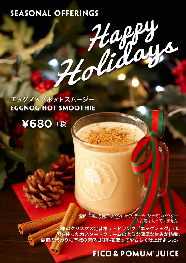 “ヘルシーファストフード”をコンセプトとするスムージー専門店「FICO & POMUM JUICE」(フィコ&ポムム ジュース、以下フィコ&ポムム)は、クリスマスシーズンの期間限定ドリンクとして、北米でクリスマスの定番ドリンクとして親しまれる「エッグノッグ」を販売します。卵を使ったカスタードクリームのような甘さが特徴のクリスマスドリンク「エッグノッグ」を、フィコ&ポムムのこだわりであるヘルシーさでアレンジしホットスムージーに仕上げました。