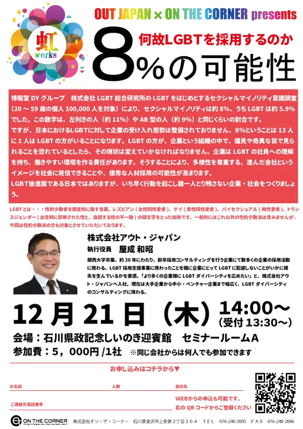 株式会社オン・ザ・コーナー(所在地:石川県金沢市、代表取締役:西江 顕治)は、LGBT就職支援事業「虹ワークス」を立ち上げました。それに伴い、北陸の企業が深い理解を得てLGBTの方の働きやすい環境をつくり誰一人とり残さない社会を築くために、LGBT人事セミナー「8%の可能性 ~何故LGBTを採用するのか~」を12月21日(木)に開催いたします。