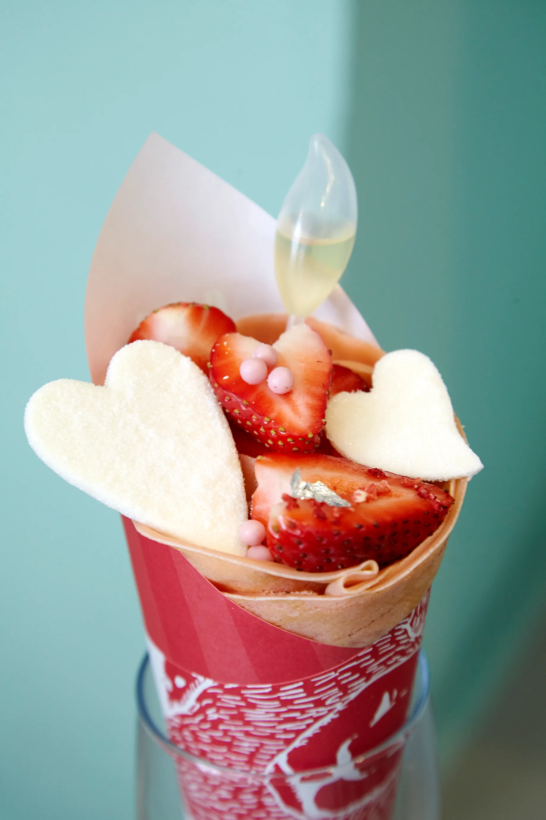 甘い冬の苺を金沢産の熊野水木蜂蜜、練乳、苺のクリーム等と合わせて特製の苺生地で巻き上げる花束の様なクレープ。
