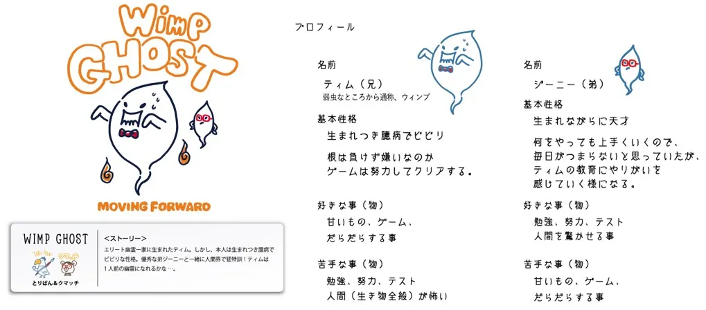 「 WIMP GHOST」は、エリート幽霊一家に生まれた長男ティム。しかし生まれつき臆病でビビリな性格で、一人前のゴーストになるために優秀な弟のジーニーの教育のもと人間界で猛特訓するお話。