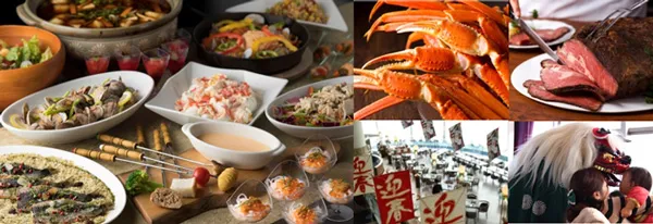 大人気のアメリカンローストビーフや、冷製ボイルズワイガニ、チョコと抹茶のバームクーヘンに加え、お正月らしくお餅を使ったもち餃子のスープ仕立てなど、お子様からご年配の方までお喜び頂ける多彩なメニューをご用意しております。