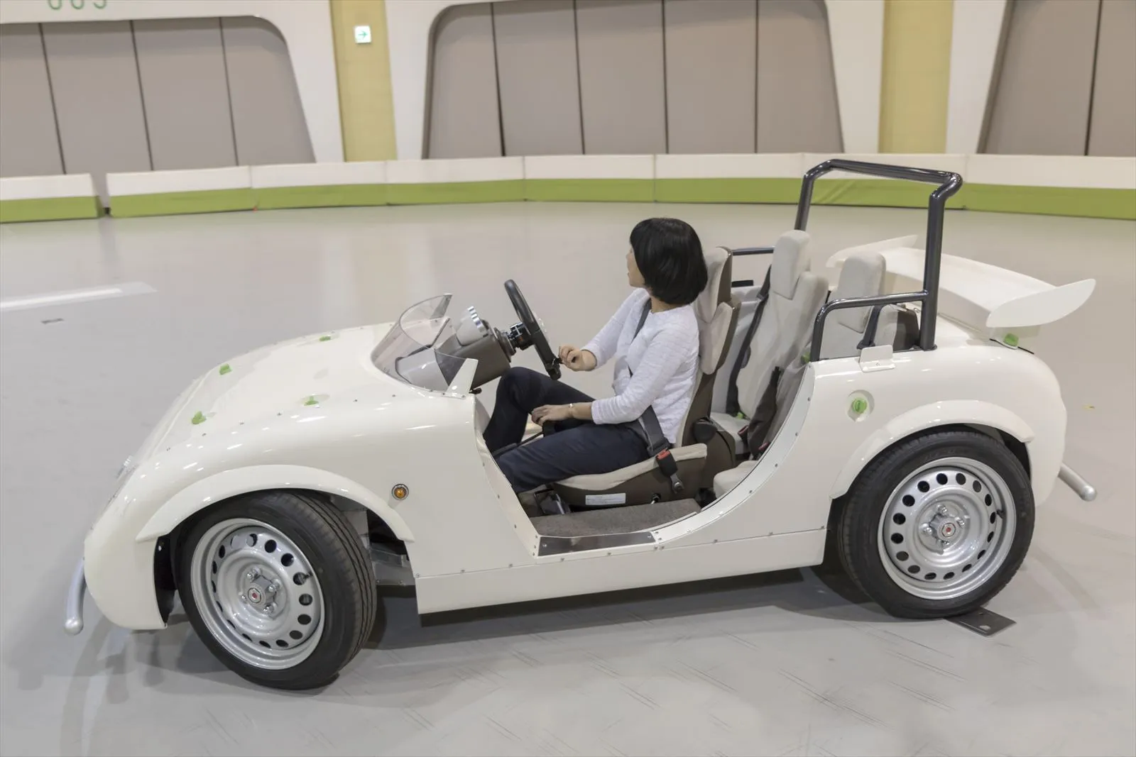 ライドスタジオで人気のアトラクション、3人乗りの電気自動車「Camatte」に導入することで、より多くの方にお楽しみいただきたいと企画しました。足の不自由な方でも、親子で一緒に楽しめる「Camatte」の運転を体験することができます。