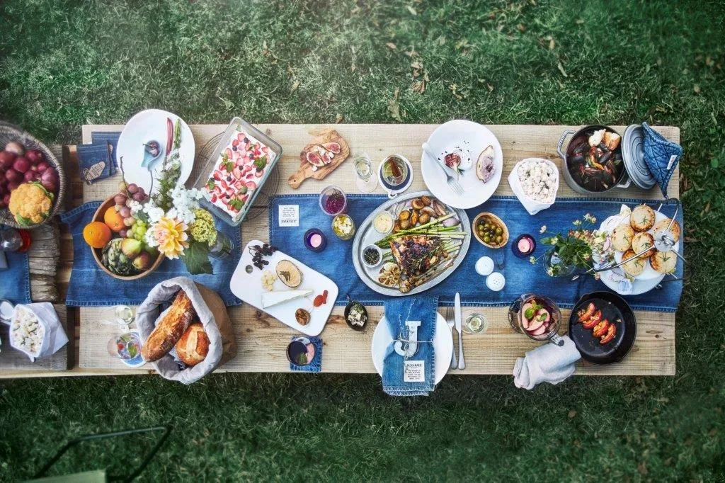 使い込むほどに味わい深くなる、デニムを基調としたテーブルセッティングは、アウトドアでのカジュアルなギャザリングを演出します。