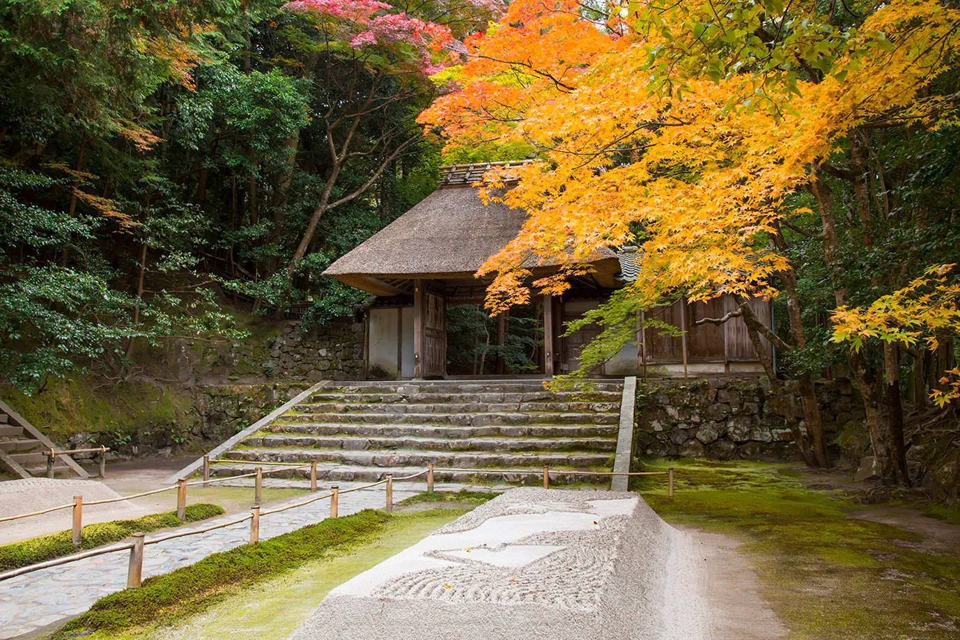 紅葉に包まれた山門付近に、