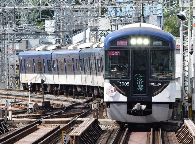 京阪電車では、紅葉めぐりに便利な快速特急「洛楽」(京橋~七条駅間ノンストップ)を毎日運転しています。11月26日(日)までの土休日は、「秋のおでかけダイヤ」として「洛楽」の増発運転を行っており、期間中は座席指定の特別車両「プレミアムカー」を連結した8000系車両、または正面デザインを変更した3000系車両でのお出かけをお楽しみいただけます。