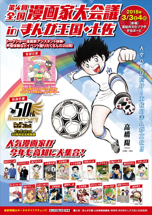 今回は、世界中のサッカー少年に影響を与えたまんが「キャプテン翼」の高橋陽一先生や2018年NHK正月時代劇で実写化される「風雲児たち」のみなもと太郎先生などのトークショー、ビッグコミック創刊50周年記念の原画展、食まんがを再現するフードブースなどの新企画で盛り上げます。前回、漫画家の先生と交流できると好評だった「土佐のおきゃくで漫画家大会議」は、土佐の「おきゃく」2018(3月3日(土)~11日(日))とコラボします。