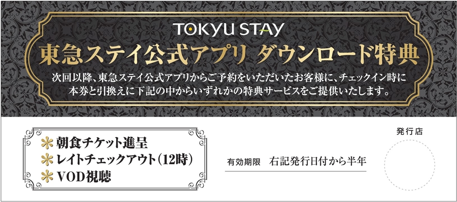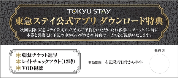 「東急ステイ 公式アプリ」の誕生を記念し、東急ステイ各店にて先着1万名様にアプリダウンロード特典をご用意いたしました。アプリをダウンロードして会員登録を行っていただき、フロントにてスタッフにホーム画面を見せていただいたお客様に、次回以降ご利用可能なクーポン券を進呈します。