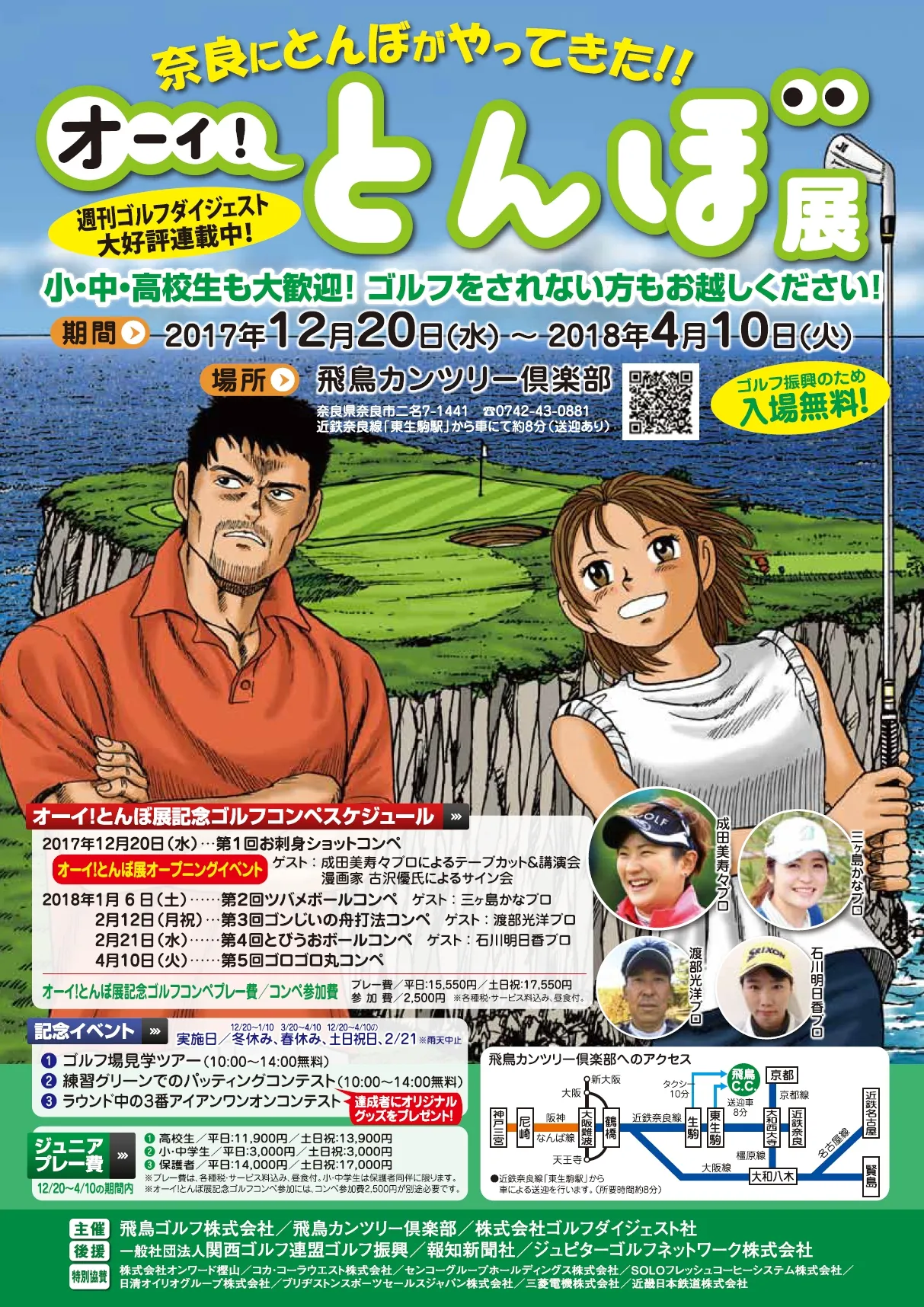 全国2000余のゴルフ場では初の試みであり、期間中は「オーイ! とんぼ」の原画の展示に加え、作者である漫画家の古沢優氏によるサイン会、女子プロゴルファーの成田美寿々氏、三ヶ島かな氏などをゲストにお招きしてのゴルフコンペやパッティングコンテストなどを行います。なお、本展および本展開催中のイベントは、飛鳥カンツリー倶楽部の会員以外の方もお楽しみいただけます。