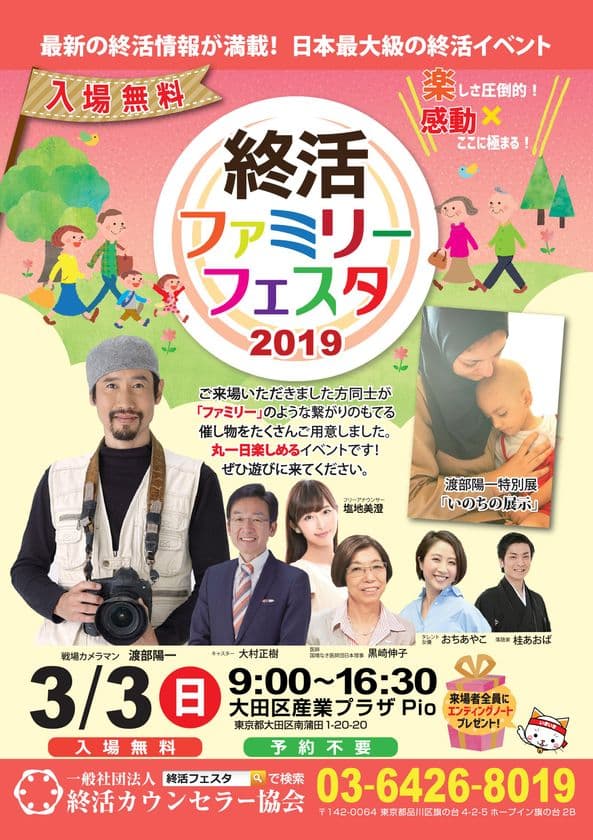 第1回来場者2,100名・第2回来場者3,200名・第3回来場者3,500名・第4回来場者3,250名を動員し大盛況だった終活フェスタがパワーアップして2017年も開催。テーマは「エバーグリーン、心の健康・体の健康」ステージイベントの目玉は代表 武藤の講演、女優 仁科亜希子参加のパネルディスカッション。俳優 賀集利樹とその兄による兄弟対談、納棺士による「模擬納棺の儀」等、盛り沢山です。