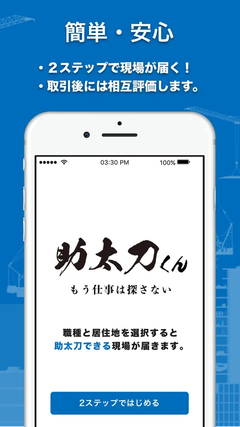 助太刀くんを始めるのに、面倒な登録は必要ありません。職種と居住地を選ぶだけ。たった2ステップであなたにぴったりの現場がオンタイムで届きます。