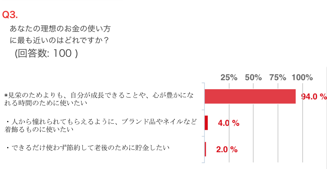 全国20歳~59歳の働く女性100人を対象に行った理想の働き方アンケート(淡麗女子事務局調べ)では、いわゆる「バリキャリ女子」の働き方をしたい人(忙しくても、キャリアを優先し、仕事にやりがいをもってバリバリ働きたい)4%、いわゆる「ゆるキャリ女子」の働き方をしたい人(稼ぎは少なくても、家庭や趣味・交友を優先してマイペースで働きたい)26%と大差をつけて、淡麗女子の働き方をしたい人(自分で責任を持ちながらも、しっかり稼いで、仕事やプライベートを分けず、生きがいになるような仕事がしたい)が70%という結果になりました。
