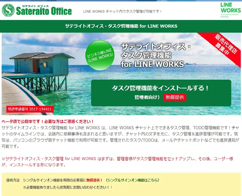 サテライトオフィスは、LINE WORKS導入支援の中で、LINE WORKSで利用可能なシングルサインオン機能、ワークフロー機能、掲示板/回覧板機能、ドキュメント管理機能、CRM機能、タイムカード/勤怠管理機能、安否確認機能等を無償/有償提供しております。今回は、LINE WORKS導入企業から要望が多かった、LINE WORKSとシームレスに動くタスク/TODO管理機能を開発し、当社開発のアドオンツール「シングルサインオン for LINE WORKS」の導入企業向けに無償提供します。当初はパソコンのブラウザ版チャット機能で利用可能です。