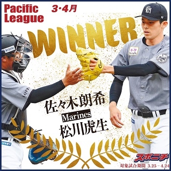 株式会社スポーツニッポン新聞社(本社:東京都江東区、代表取締役社長:小菅洋人、以下スポニチ)とスポーツ動画配信サービスのDAZN(ダゾーン)は16日、「2022プロ野球最優秀バッテリー賞 powered by DAZN」の3-4月度月間賞(対象期間は3月25日~4月24日)を下記の通り発表しました。DAZNの公式Twitter(@DAZN_JPN)でのファン投票の結果、セ・リーグからは阪神・青柳晃洋投手(28)と梅野隆太郎捕手(30)、パ・リーグからは千葉ロッテ・佐々木朗希投手(20)と松川虎生捕手(18)のバッテリーが選出されました。
