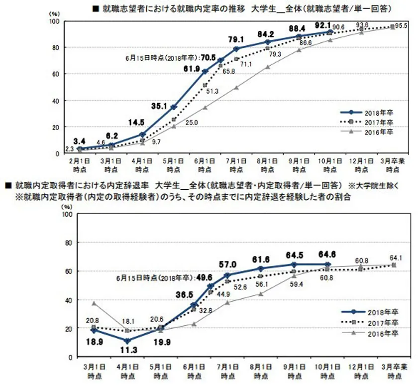 リクルートキャリアが発表したように、2018年卒の就職希望者における内定率は92.1%となっており、その中でも際立つのは、内定辞退率の高さです。(2017年10月1日時点で64.6%)