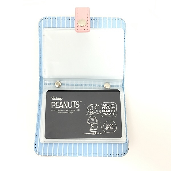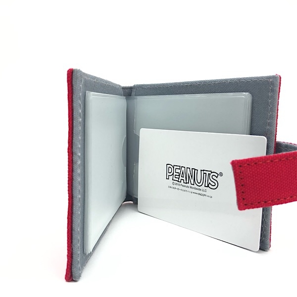 中を開くとカードホルダーがあります。ホックで留められるのもポイントですね。PEANUTSのロゴタグ付きです。
