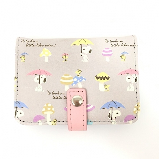 レインシリーズのシックなカードケースもご紹介。淡いベージュカラーにパステルの傘をさしたスヌーピーがたくさんいます♪サイズは105×75×20mmで、カードが10枚収納できます。