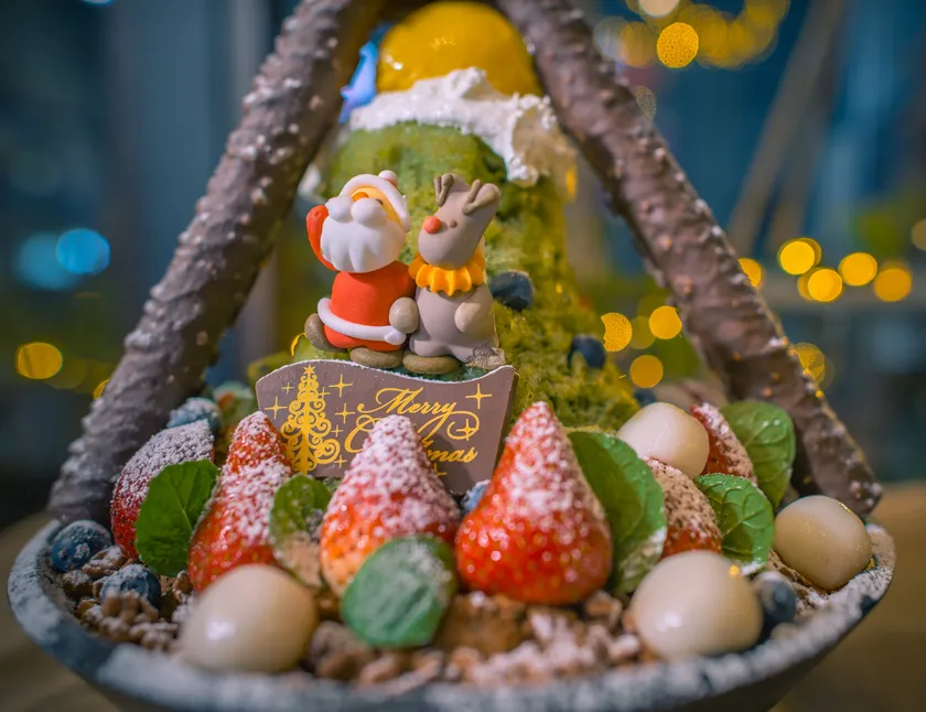 このかき氷は、柑橘系フルーツを散りばめた、台湾で親しまれているほんのり甘い味わいの冬瓜ゼリーをベースに、抹茶かき氷がクリスマスツリーとなり、いちごやブルーベリー、ミントやタピオカ、白玉などのオーナメントが彩りを加え、サンタとトナカイが乗る板チョコのソリの上にはマンゴーアイスのお月様。そしてチョコ棒の木の上高くに燦然と輝くゴールドスターが特徴です。