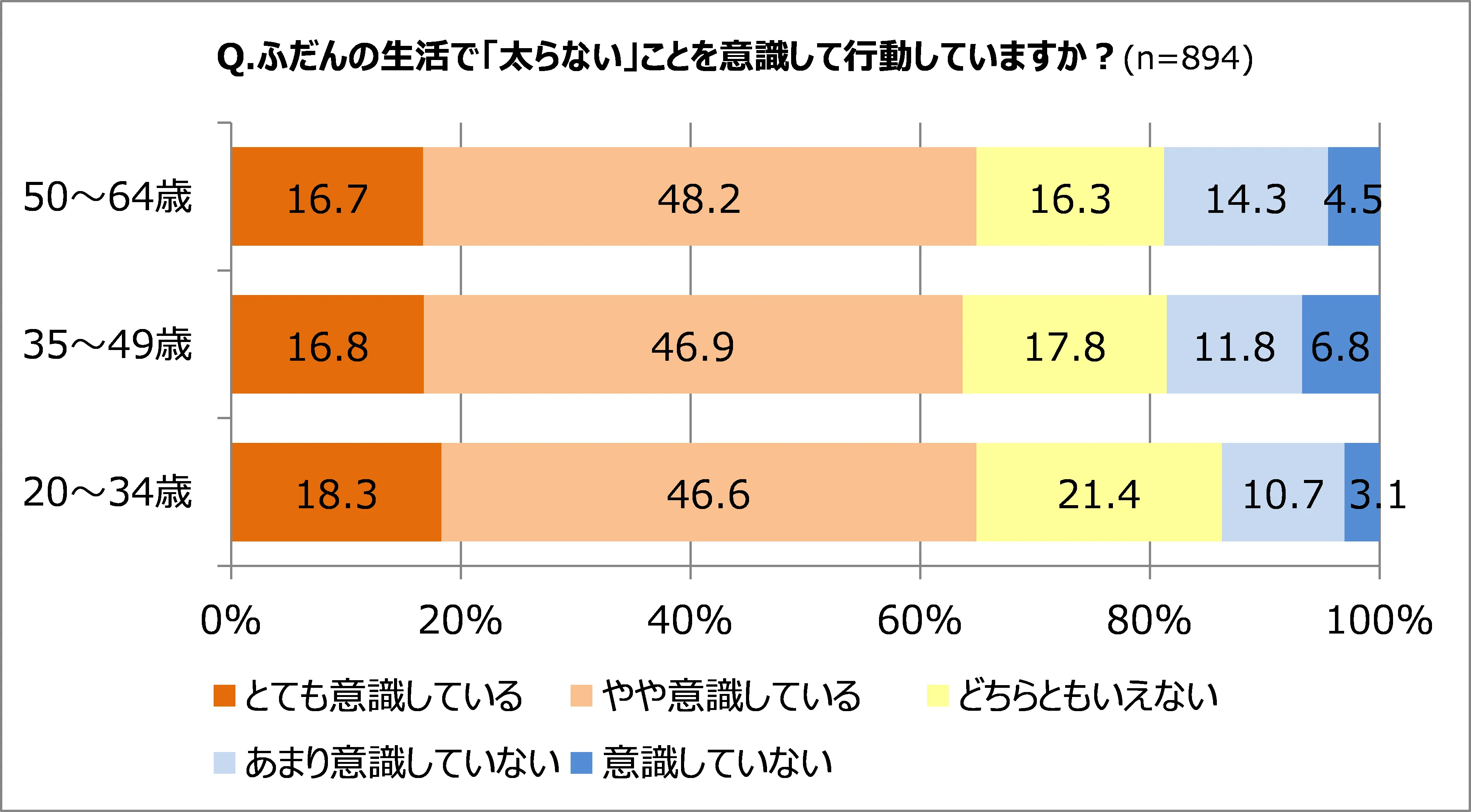 「ふだんの生活で「太らない」ことを意識して行動していますか?」という質問には、「とても意識している・やや意識している」と回答したのは50~64歳で64.9%、35~49歳63.7%、20~34歳では64.9%と、世代の差がほとんどありません。ダイエットの経験も50~64歳で70.2%、35~49歳70.8%、20~34歳では77.9%と、若い世代がやや高いものの、35~64歳では大きな差異は見られません。しかし「ちょっと太ってきた/体型が気になる」などの悩みの解消に取り入れている行動では、50~64歳で一番多いのが「ウォーキング」46.1%、35~49歳「食事や飲酒の制限」46.1%、20~34歳でも「食事や飲酒の制限」53.4%、と差がでました。「おとな世代」のダイエットでは「食べ過ぎ」もさることながら、まずはカラダを動かすことで「太らないように」と行動をしていることが伺えます。