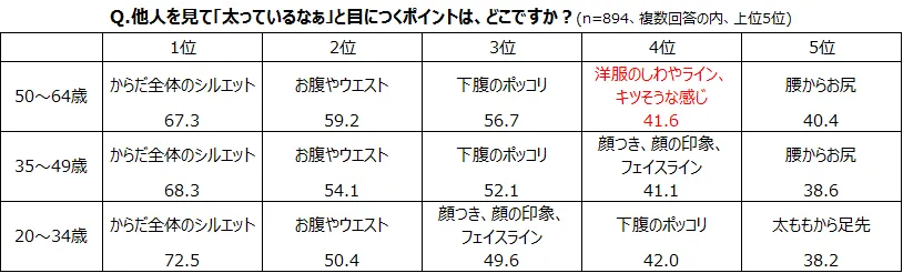 「他人を見て「太っているなぁ」と目につくポイントは、どこですか?」という質問には、どの世代も「からだ全体のシルエット」が1位に挙げられますが、「おとな世代」の特徴は「洋服のしわやライン、キツそうな感じ」が4位と上位にあがり、「人のふり見てわが身を振り返る」ところにあります。