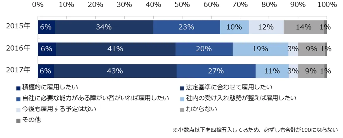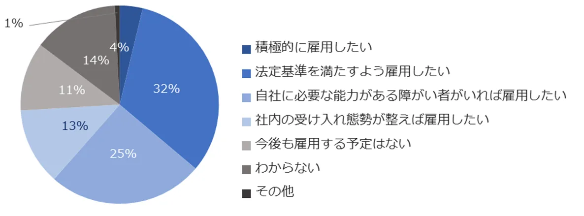 今後の障がい者雇用の予定を伺うと、「積極的に雇用したい」(4%)「法定基準に合わせて雇用したい」(32%)という企業は、合わせて36%でした。従業員数50名以上の企業に絞ると、同ポイントは49%まで上昇します。2年連続で増加しました。