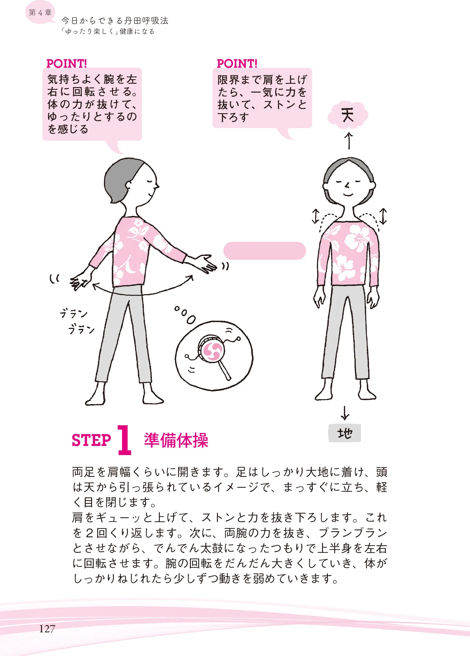 さらに、本書では、丹田呼吸の効果を高めるための「丹田フラダンス」や、肩こり、ひざ痛などの目的に合わせた「呼吸法ストレッチ」なども紹介。そして、実際に丹田呼吸法を体験した結果の喜びや驚きの声も掲載し、具体的にどんな効果があったのかなどを紹介しています。