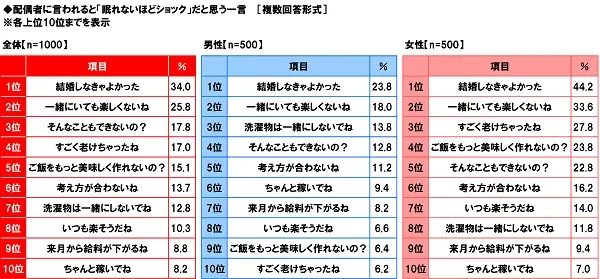 全回答者(1,000名)に、配偶者に言われると「眠れないほどショック」だと思う一言は何か聞いたところ、1位は「結婚しなきゃよかった」(34.0%)となり、結婚したことを後悔するかのような言葉に大ダメージを受けるとの意見が最も多くなりました。そして、2位は「一緒にいても楽しくないね」(25.8%)、3位は「そんなこともできないの?」(17.8%)と続きました。相手と過ごす楽しさを否定したり、相手をバカにしたりするような言葉には、大きなショックを受けるようです。