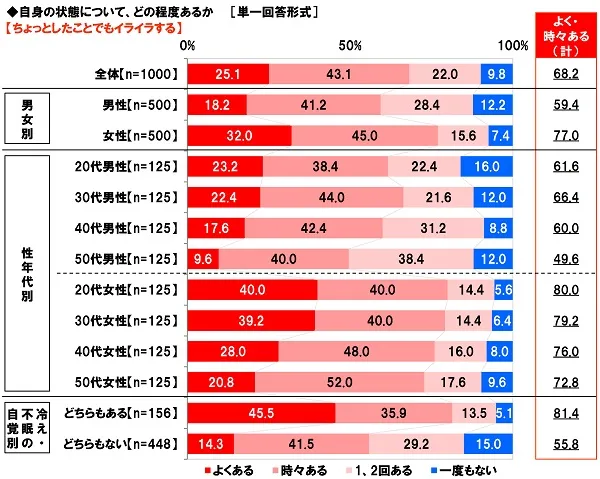 ◆メンタルにもマイナス?冷え&不眠に悩む人の8割強が些細なことにイライラする傾向