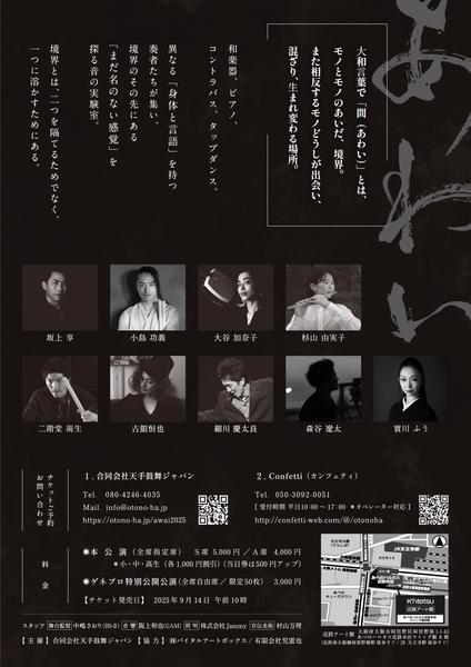 異なる文化背景を持つ表現を組み合わせ、「触れる」「弾く」「打つ」「踏む」という根源的な行為を出発点に、これまで経験したことのないような劇場体験を提供するべく集結し、舞台を囲むように配置された三面客席を持つ大阪の近鉄アート館で世界初演となる「あわい」を発表いたします。