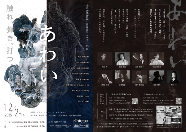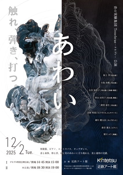 合同会社天手鼓舞ジャパン主催、音の実験集団 Tenebrae(テネブレ)公演「あわい」が2025年12月2日 (火)に近鉄アート館(大阪府大阪市阿倍野区阿倍野筋1-1-43 あべのハルカス近鉄本店ウイング館8階)にて上演されます。