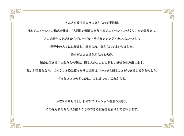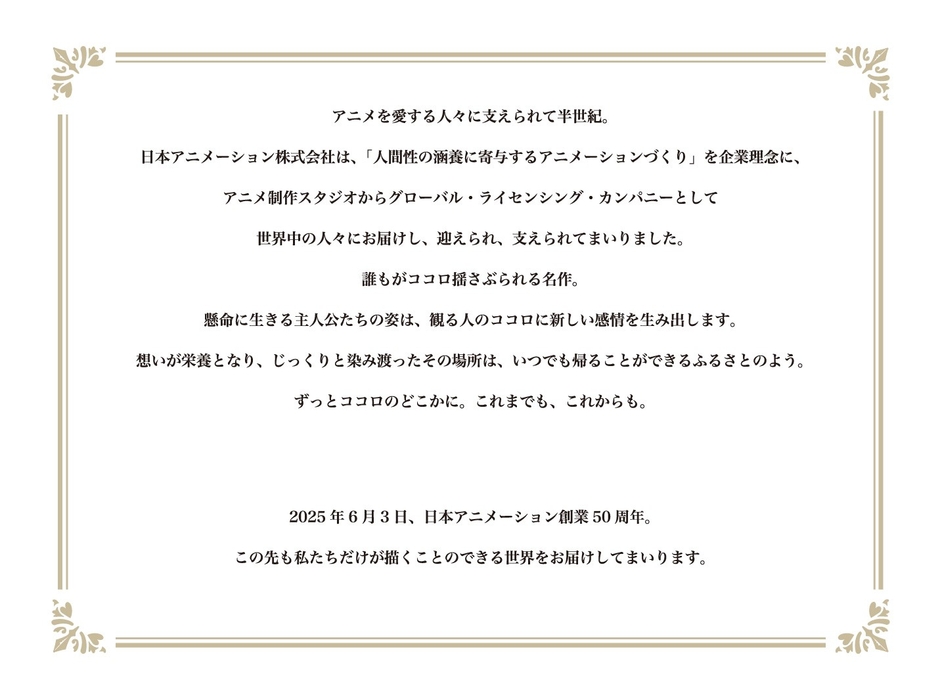 日本アニメーション株式会社(本社:東京都中央区、代表取締役社長:石川和子)は、本日2025 年6 月3 日(火)に創業50 周年を迎えました。これまで日本アニメーション作品を愛してくださったファンの皆様、そして作品を支えてくださった関係者の皆様に心より感謝申し上げます。
