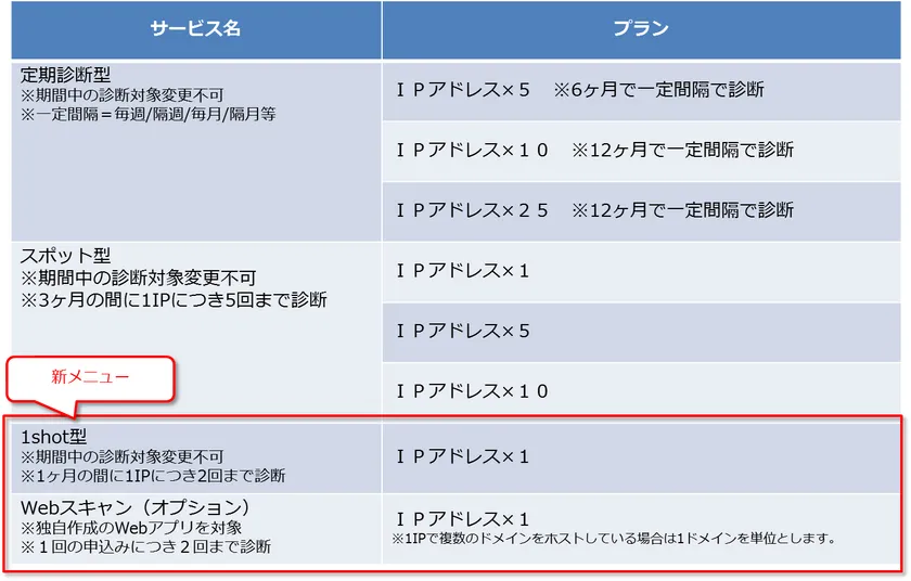 これまでの定期型(最小単位5IP~)やスポット型(最小単位1IP~)に比べ、手軽に診断を試すことができるようになったことで「最低限の診断だけ実施したい」「導入検討のために試験的に脆弱性診断を実施したい」「他社サービスからの乗り換えを検討したい」といった、お客様の様々なニーズに対応いたします。